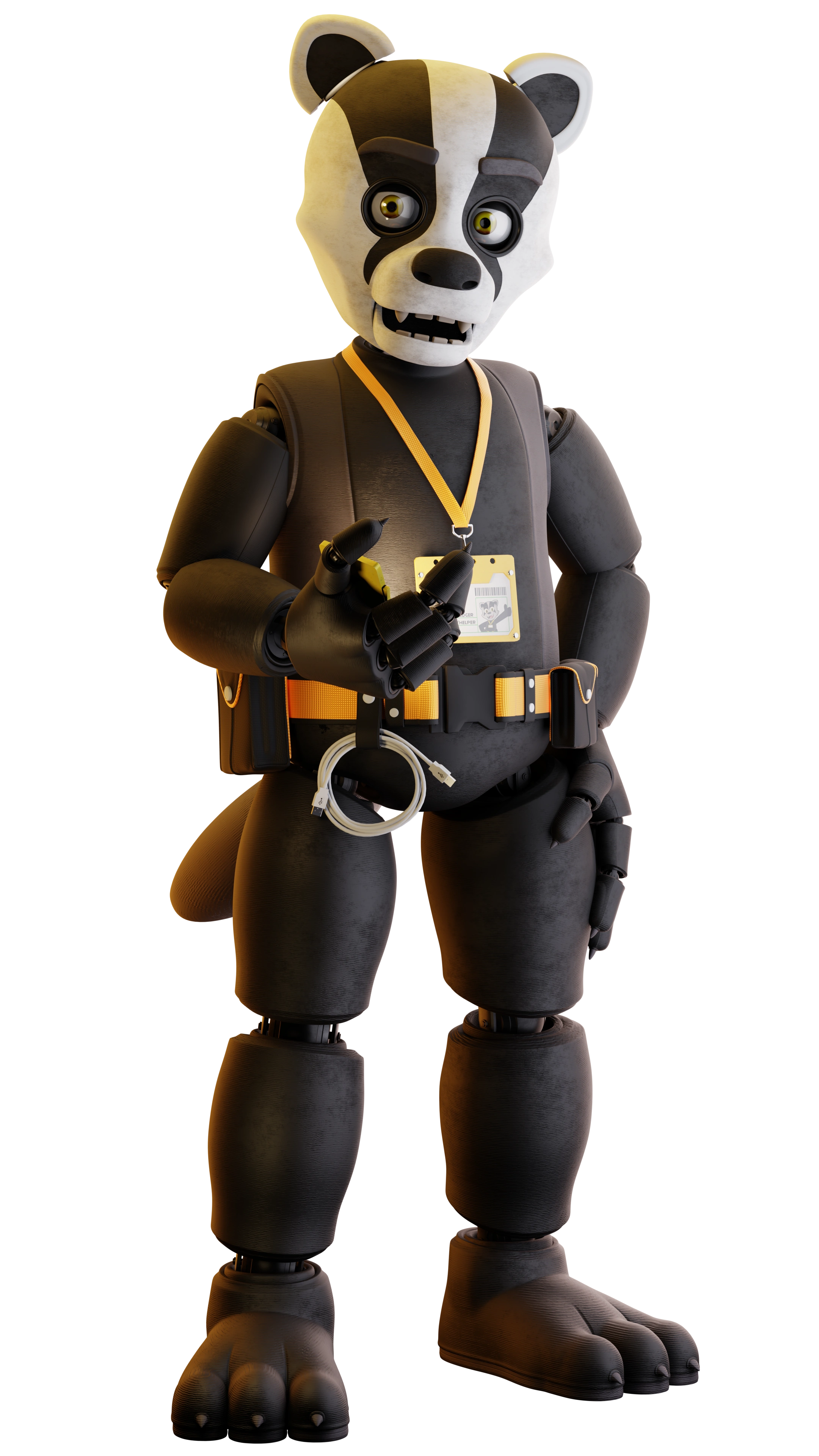 Blake is an European badger animatronic with an overall black-and-gray body, small claws, shorter tail, and a white head with black stripes, thicker eyebrows, large nose, and yellow eyes. He wears a yellow tool belt around his waist and a lanyard with a yellow keycard.