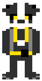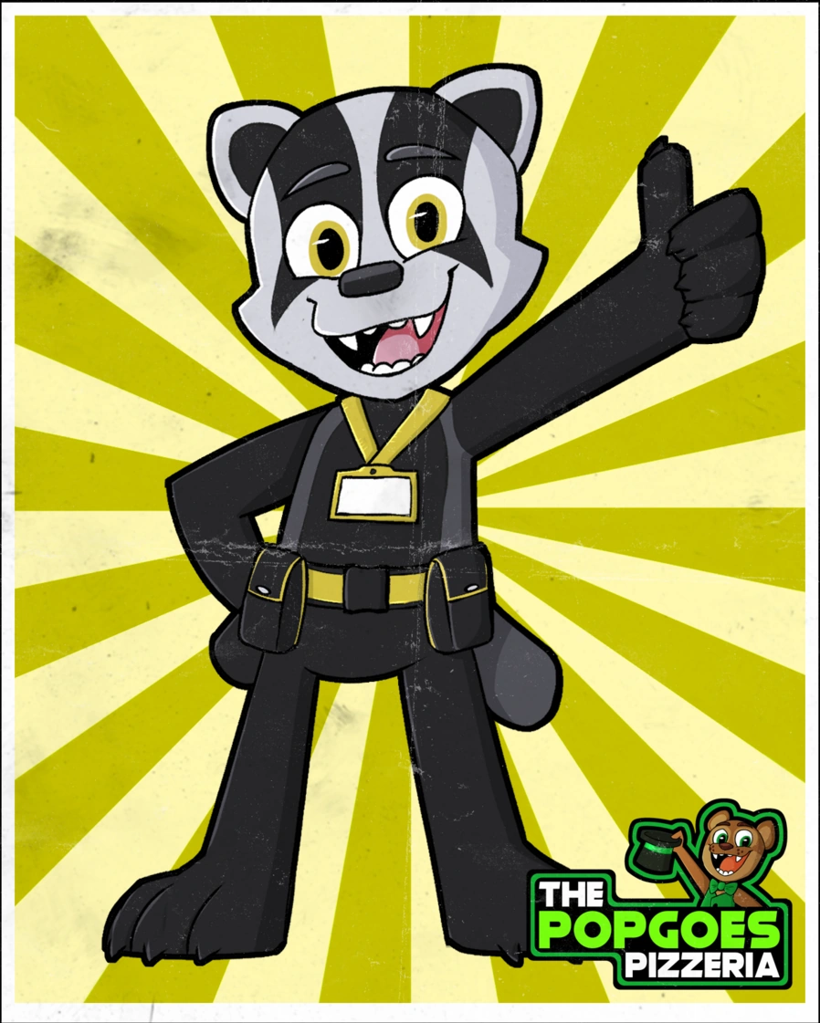 Blake is a European badger that wears a yellow toolbelt around his waist and a yellow keycard around his neck.
